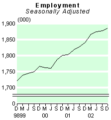 MORE COMMENTS ON THE LATEST STATISTICS ...Infometrics senior economist, Tony Booth, believes however that the unemployment rate could also drop further — possibly to as low as 4.5% by the start of next year. Booth: “It depends to a great extent on how much migration stops. The government has taken some measures to tighten up on migrants coming in, in terms of English language requirements and so on ...” Wages are generally expected to start rising if unemployment remains below 5%, although they grew by just 2.1% last year compared to inflation of 2.6%. The economists surveyed by Dow Jones have commented that inflationary pressures from the growth in employment are being negated by the strong NZ dollar, and concerns about the world economy. Sources — Dow Jones Newswire 10 February 2003 “NZ jobs growth likely to remain robust in 4Q” and 11 February 2003 “NZ Jobs Data underline 1H Rate Cut unlikely”; NZPA 12 February 2003 “Unemployment rate falls to 15-year low” by Melanie Carroll.But CTU Economist Peter Conway says that the level of 98,000 people unemployed is still far too many given the strong demand for workers. Conway: “While in a dynamic labour market there is some unemployment as people move between jobs, there is clearly a contradiction when we have employers calling out for workers, but there are still nearly 100,000 out of work.” Conway says the answer lies partly in much better targeting of the training needs for the unemployed, and more assistance in the transition to work. Source – Press Release CTU Peter Conway 11 February 2003 “Still Too Many Unemployed – CTU”Newman points to official answers to her parliamentary questions which show that more than 42,000 NZ’ers, who are currently on the dole, have been paid benefits for more than two years. Newman: “ It is, therefore, deeply disturbing to discover that there are 37,000 New Zealanders who now appear to be missing. My question to the government is: where are they? They do exist. They are real people, who have been on benefits for more than two years — yet have not been incorporated into Government statistics...” Newman’s view is that the Labour government is “hiding behind the smokescreen of the Labour Force Household survey — which does not count people as unemployed if they are not actively seeking work, or have worked for more than one hour in the past two years.” Source – Press Release Muriel Newman 12 February 2003 “Government loses unemployed”AUCKLAND DRIVES JOB ADSThe ANZ job ads series reports that there is a growing dichotomy between job ads in Auckland and in the rest of the country. Auckland job ads were up 30.1% on levels prevailing at the same time last year. But all other regions, except Christchurch, have recorded a fall in job advertising levels over the year. ANZ Chief Economist David Drage: “After a period of robust growth, activity in some provincial centres has plateaued as the headwinds of a difficult international environment and recent strong gains in the Kiwi dollar feed through to rural incomes. To the extent that this has been reflected in job ad trends, the contrasting regional developments suggest that employment growth over the year ahead will be increasingly driven by Auckland…” Source – ANZ Job Ads survey for 12 February 2003 “Auckland to drive further employment growth” by David Drage